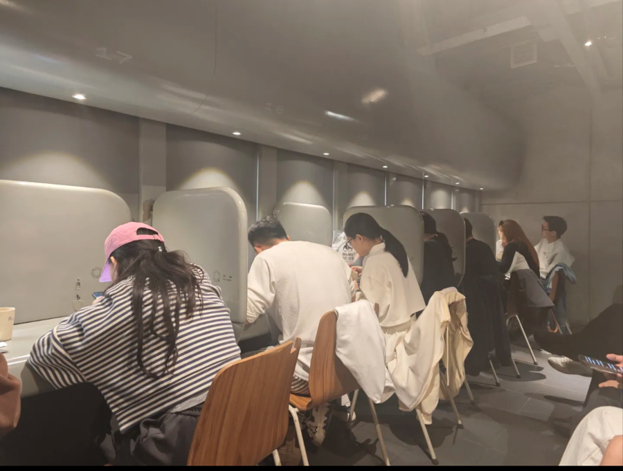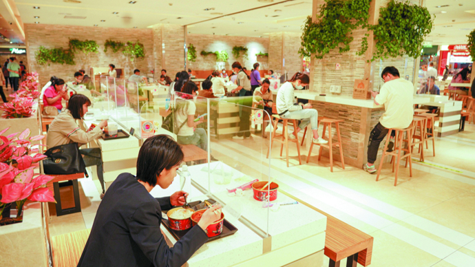 “一人食”更有想象力的场景,从自习室复制而来,整个餐厅进行了空间重塑。在北京、广州的一些拉面馆,都有像自习室或工位一样的隔间。每个餐位只限一人就座,左右挡板将邻座隔开,彼此看不见对方,前方甚至悬挂布帘,眼前只有食物,整个餐馆几乎没什么交谈声。