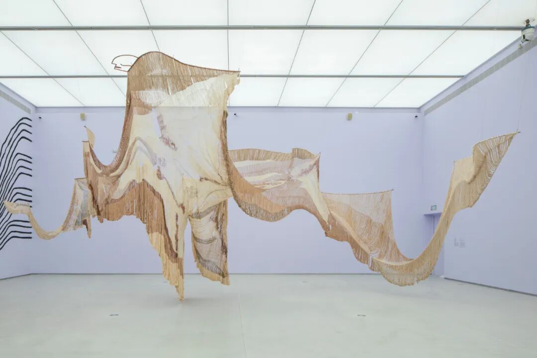 甫一走进本届上双的展厅,迎面而来的是两棵金灿灿的“风铃树”——当然并不是真的树木,只是人工营造的景观。但通透的空间,洒进展厅的阳光,满地的黄花,这样的开篇无疑直观上启引了观展的愉悦心情,用如今流行的说法是“氛围感”——是不是很接地气?开幕式上,来宾纷纷在风铃树下拍照留念,开幕限定表演也在此进行。笔者迄今已“二刷”上双,第二次参观特地选了一个工作日下午,人气依然足,阳光也很好;树下,一群孩子在欢乐嬉戏,还有的拿着Jellycat的小蜜蜂玩偶(恰巧与本届上双主题呼应)在拍照……我们有多久没有在一场当代艺术展上感受到久违的童心还有纯粹的快乐了呢?