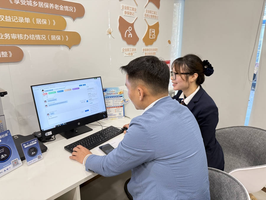 袁先生在银行工作人员帮助下办理社保业务。