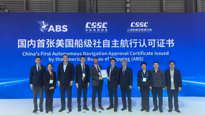 12月4日,在中国国际海事技术学术会议和展览会上,搭载中国船舶集团第七〇四研究所自主研发的自主航行系统82000吨散货船“CS JINAN”轮,获得美国船级社(ABS)颁发的中国首张自主航行认可证书,也是全球首条散货船获得的ABS船级社自主航行认可证书,被业界誉为全球散货船自主航行发展的重要里程碑,将为行业树立新的技术标杆,引领自主航行技术迭代升级。