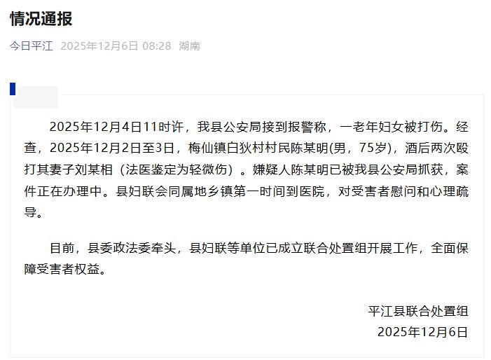 2025年12月4日11时许,我县公安局接到报警称,一老年妇女被打伤。经查,2025年12月2日至3日,梅仙镇白狄村村民陈某明(男,75岁),酒后两次殴打其妻子刘某相(法医鉴定为轻微伤)。嫌疑人陈某明已被我县公安局抓获,案件正在办理中。县妇联会同属地乡镇第一时间到医院,对受害者慰问和心理疏导。