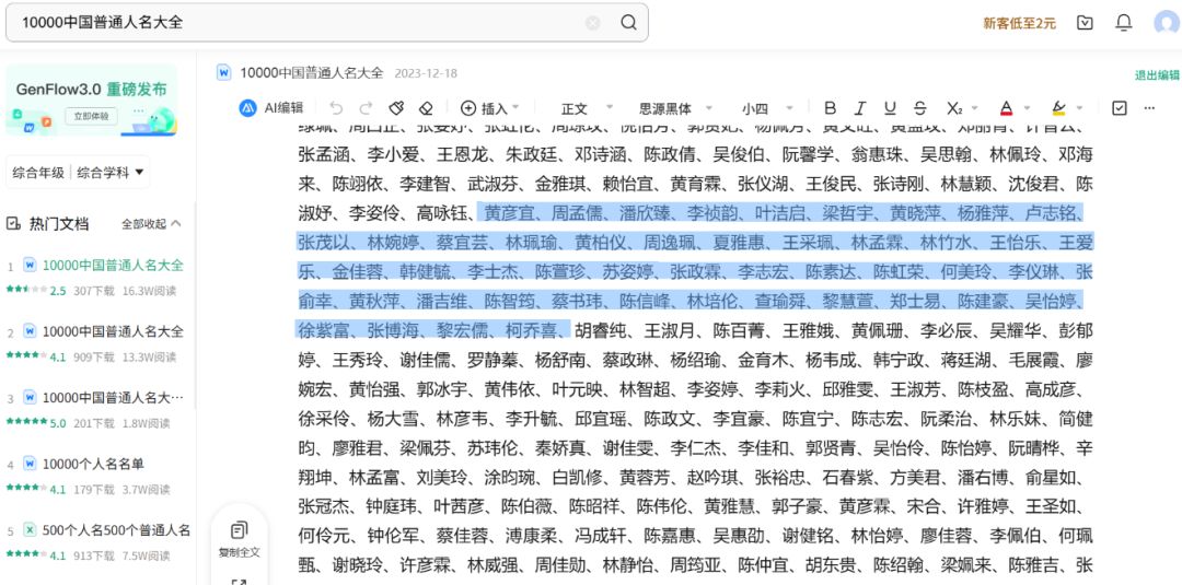 根据网友提供线索,名为“辽宁省科技企业知识转化平台”的网页,2024年9月30日发布的一份《2024年辽宁省非公有制高级职称评审通过人员名单公示》中,公示的58人中有48个名字和百度文库《10000中国普通人名大全》部分名单一致。