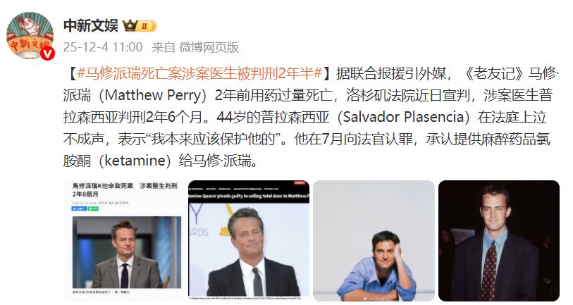 近日,中新文娱消息,《老友记》马修·派瑞(Matthew Perry)2年前用药过量死亡,洛杉矶法院近日宣判,涉案医生普拉森西亚判刑2年6个月。44岁的普拉森西亚(Salvador Plasencia)在法庭上泣不成声,表示“我本来应该保护他的”。他在7月向法官认罪,承认提供麻醉药品氯胺酮(ketamine)给马修·派瑞。