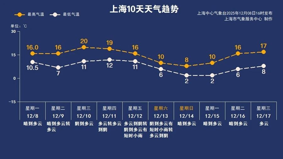周末(12月13日起):一股较强冷空气抵沪,将带来明显大风降温和降水过程。届时气温将被压制在个位数,上海可能借此正式开启入冬进程。