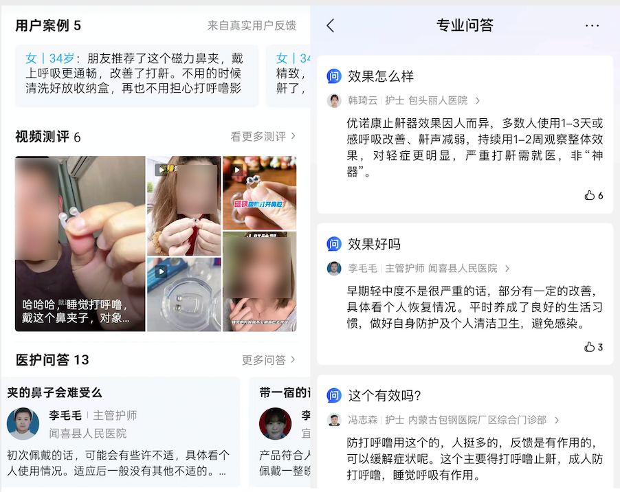 这样的“三无”鼻夹在所谓的“医护问答”板块还配有医护人员对产品的介绍——“反馈有作用,可以缓解症状”“针对打鼾有很好的帮助”等。