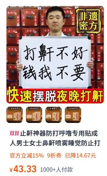 淘宝上一家名为“百年张氏中医馆总店”的四皇冠店铺在售一款止鼾贴,号称是“传承百年的古方止鼾贴”,可以快速起效。该产品生产商告诉记者,如果不多宣传功能,产品就不好卖,主要还是看平台审核是否严格。