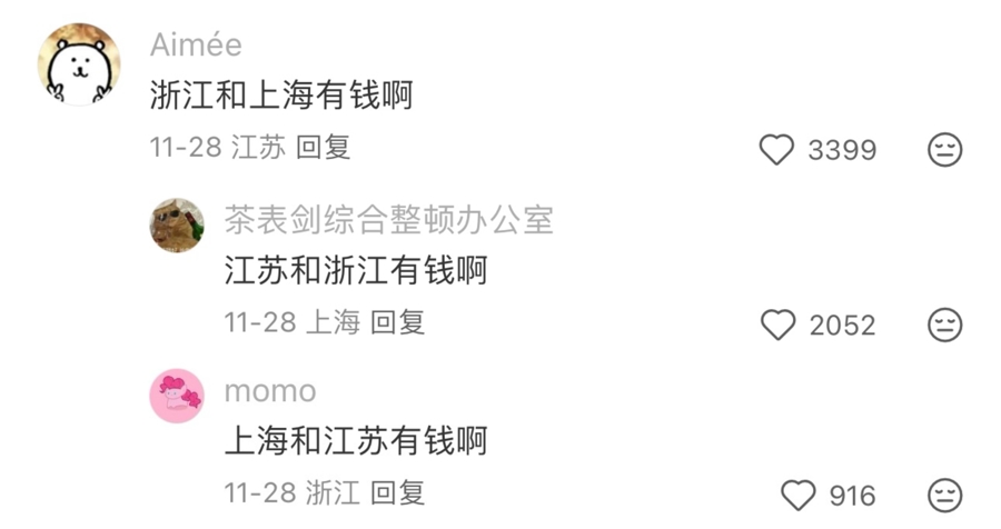 评论区里,一场大型的“互夸接龙”默契上演。江苏网友一句“浙江和上海有钱啊”,精准叩响了共鸣的琴键。紧随其后的,是上海网友与江苏网友的复诵:“江苏和浙江有钱啊”“上海和江苏有钱啊”……这场面,像极了三位实力相当的优等生,在成绩公布后互相谦让却又心照不宣。