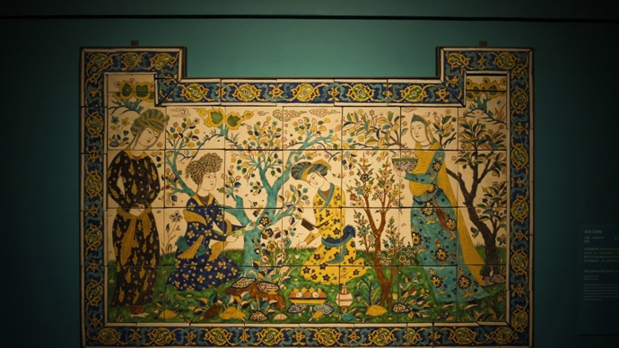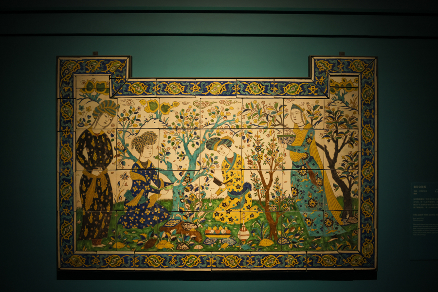伊朗萨法维王朝的纷繁艺术成就,在有着蓝紫色神秘色调的展厅中铺展。美轮美奂、繁复多彩的陶瓷饰板,是其中尤为吸睛的一类展品,往往承载了文学母题和诗歌意象,堪称“会说话的艺术品”。17世纪中叶的一块诗会图釉面陶板,由多块小陶板拼接而成,面积约两平方米,描绘了两名男青年斗诗的场景,一人正在写诗,另一人正吟诵诗句。该陶板被推测源自伊斯法罕王室建筑群中的某座亭阁,类似的饰板常用于墙裙部位,其上方则绘有壁画。