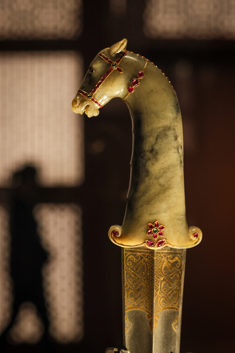 展厅外,一张偌大的地理示意图印证了这种关联。图上不仅标识了印度、伊朗、奥斯曼的疆域,还特别显示了中国的于阗(今和田)与景德镇这两个坐标。莫卧儿帝国的一众展品中,玉器以及玉元素占据不小的比重,其原材料就大多来自中国的和田。其中有把17世纪的匕首,马首柄造型惟妙惟肖,工艺极尽奢华,可能是一件赏赐重臣或赠予结盟家族的礼物,其手柄正是由玉石雕成,传说玉器能够提升胜算。在伊朗展区,一面橱窗出现了很多蓝白相间的瓷器,上面的牡丹、莲花、龙等图案,无不揭示中国传统图案与伊斯兰艺术的交汇。奥斯曼的艺术中,伊兹尼克陶瓷与中国的连接尤为紧密,不仅色彩搭配受到中国青花瓷的直接影响,很多纹样构图也可见风格化的中国元素,比如中式云纹。“只不过图案的流畅度可能更加硬朗。”努贾伊姆说。