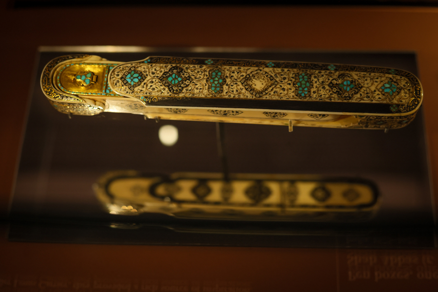 文明的交融不仅发生在不同地域之间,也跨越时光启迪着后世。呈现出16世纪风靡印度与伊朗的装饰风格的一组笔盒,是努贾伊姆特别提到的展品,主体为象牙材质,上面镶嵌着金、黄铜、绿松石等彩色珍宝,镌有萨法维王朝阿巴斯大帝的名号。它们曾是法国著名珠宝商路易·卡地亚的旧藏,卡地亚日后的不少艺术品就从中汲取了丰沛的灵感。