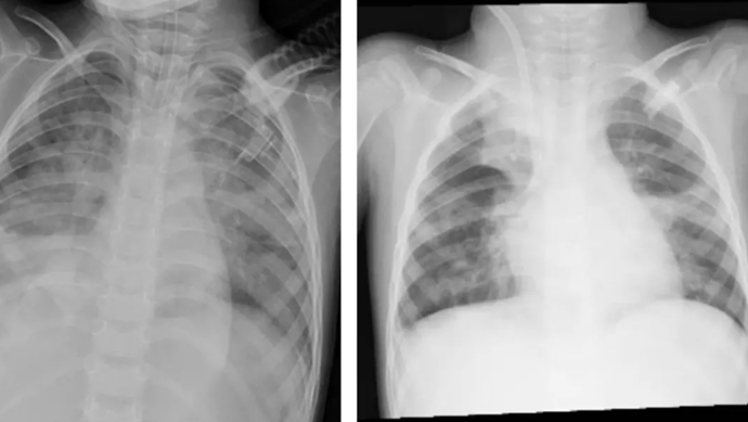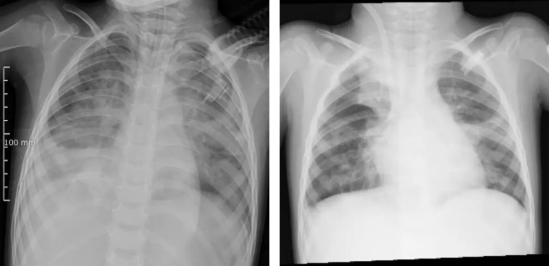 图源 河南省儿童医院(左图为ECMO上机前,肺部结构模糊,呈现“白肺”影像表现。右图为ECMO支持治疗5天后,肺部影像清晰度明显改善)