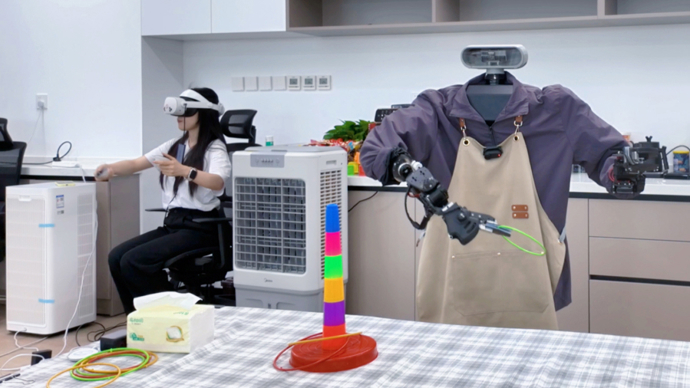 入职后,她发现自己的工作就像戴着VR设备打游戏:坐在操控台前,戴上VR头部显示设备,眼前出现屏幕,这里面有机器人的 “眼睛”(实时画面),能看清远处的情景;有 “身体数据”(电量、力量值),像游戏血条一样直观;还有 “指令面板”。手上拿着手柄,以第一视角操控机器人,机器人的“胳膊”和“手”随着她的手势缓缓移动,精准地将一块块积木摞在一起,“看上去很酷。”