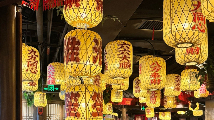 那时候还没流行“沉浸式”消费,而这里率先尝试,未进门,先闻声。穿长衫的堂倌立在门外,见客来,便拖长了调子吆喝一声:“二位——里——面——请——哟!”这声调不像喊,倒像唱,带着些江南的糯,又掺了点江北的爽利,尾音悠悠地往上扬,像把钩子,轻轻巧巧就把人勾进了另一个年月。店里是另一番天地。楹联灯幌,一色的昏黄;灰砖木窗,沉淀着旧影。八仙桌、长条凳,挤挤挨挨,人声嘈嘈,却不觉烦嚣。顶上悬着好些黄澄澄的灯笼,光晕暖暖地洒下来,笼着桌上的杯盘碗盏,也笼着食客们油光光的笑脸。墙角倚着块匾额,据说是从民间淘换来的老物件,木纹里都藏着故事。
