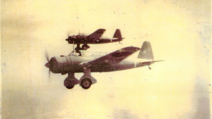 △七三一部队成员樱永孝雄驾驶97式轻轰炸机在南京上空飞行(图片由侵华日军第七三一部队罪证陈列馆提供)