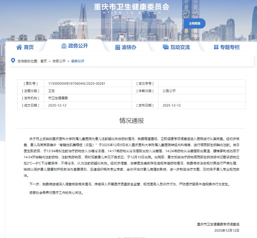 经初步核查,患儿马某某因确诊“脊髓性肌萎缩症(Ⅱ型)”于2025年12月9日收入重庆医科大学附属儿童医院神经内科病房,进行诺西那生钠鞘内注射。当日医生取药后,于13时54分将拟注射治疗药物放入冰箱冷冻层,14时17分将药物从冷冻层取出放入冷藏层,14时24分将药物从冷藏层取出复温,腰椎穿刺成功后于14时34分开始鞘内注射药物,注射完药物后,同时观察患儿未见不良反应,于12月10日出院。