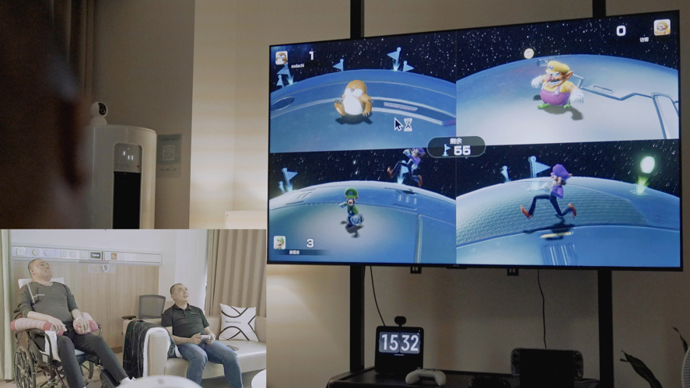 脑虎科技创始人兼首席科学家陶虎(右)与患者(通过脑机接口意念控制)游戏对战