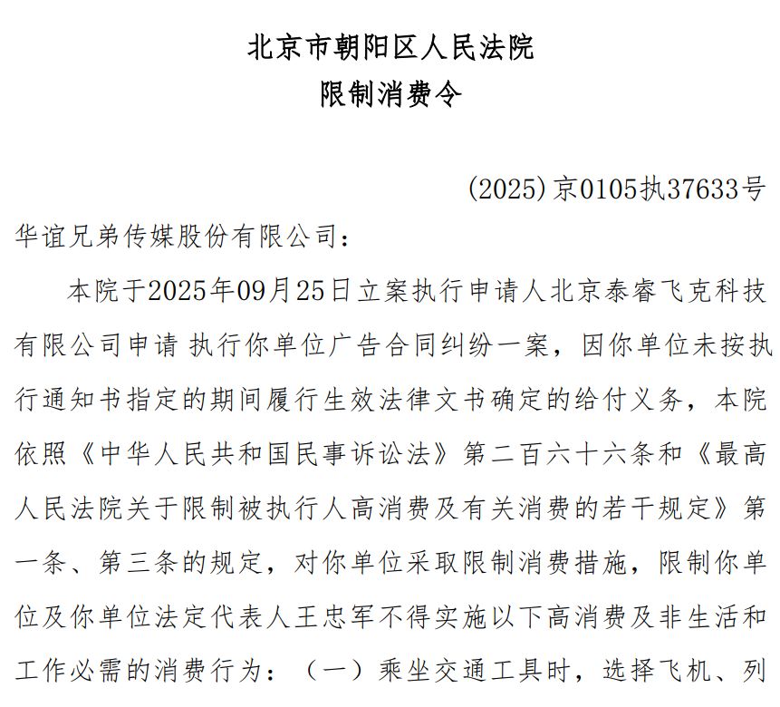 近日,华谊兄弟传媒股份有限公司(300027.SZ)及其法定代表人王忠军新增一则限制消费令。该限消令由北京市朝阳区人民法院发布,申请人为北京泰睿飞克科技有限公司,申请缘由为广告合同纠纷。案件流程信息显示,此前,该公司已被执行1140万余元。