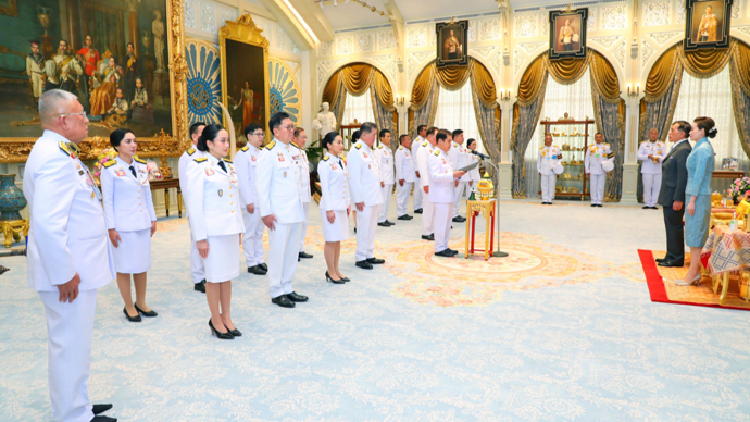 7月3日,在泰国曼谷律实宫,代理行使总理职权的泰国副总理兼交通部长素里亚·庄龙琅集率领改组后的新内阁成员向泰国国王玛哈·哇集拉隆功宣誓就职。