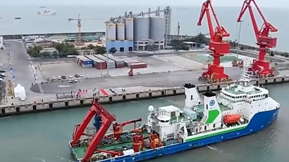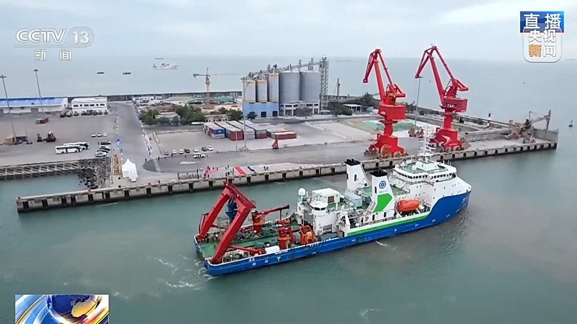 总台记者 尹平:我在位于海南三亚崖州湾南山港的码头上,这里是我们国家一座公共科考船母港。很多大型科考船,就是从这里出发,驶向祖国的深蓝。从南山港出发,展开海洋科考有着天然的地理优势。从这里出去100多公里,大概半天时间,科考船就能到达水深一千米的海域。得益于独特的地理位置,南山港就具备了“向深海进军”的优势。