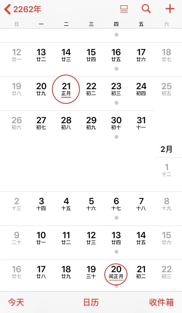 根据万年历查询,2262年1月21日是农历正月初一(第一个春节),2月20日是闰正月初一(第二个春节),这种闰正月现象十分罕见。