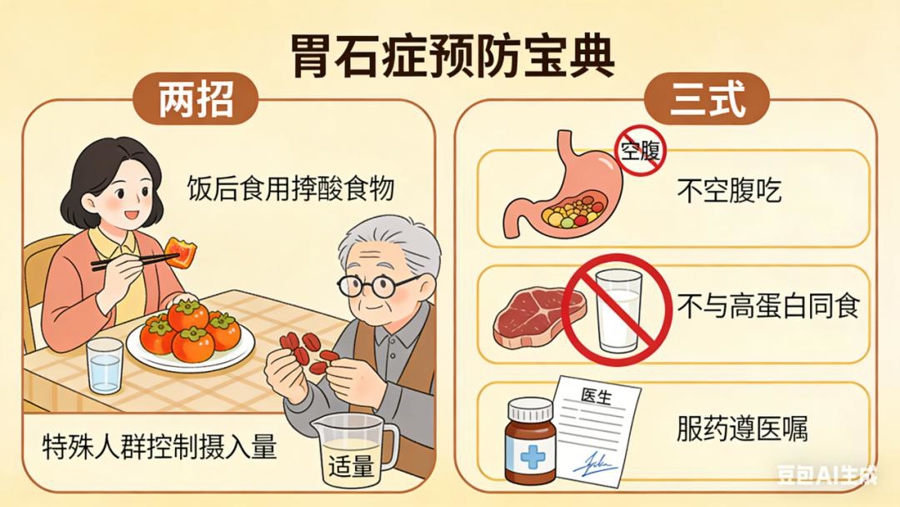 周敏提醒,预防胃石症,关键在于“选对时机吃、避开风险搭配”和“特殊人群格外当心”。应避免空腹食用柿子、山楂、黑枣等鞣酸含量高的食物,不与高蛋白食物同食,也不立即饮酒、饮茶;胃动力差、胃炎、胃溃疡患者及胃手术后的人群、老年人等需严格控制摄入量。此外,服药遵医嘱、食用鞣酸类水果后适当促进胃动力、及时排查消化功能问题,都是筑牢健康防线的好习惯。