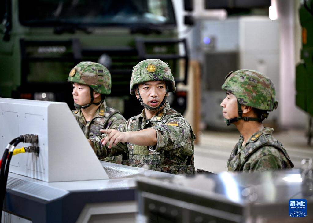 火箭军某旅发射二营高级军士利用模拟训练器材,为战友讲解操作要领(资料照片)。新华社发(刘明松摄)