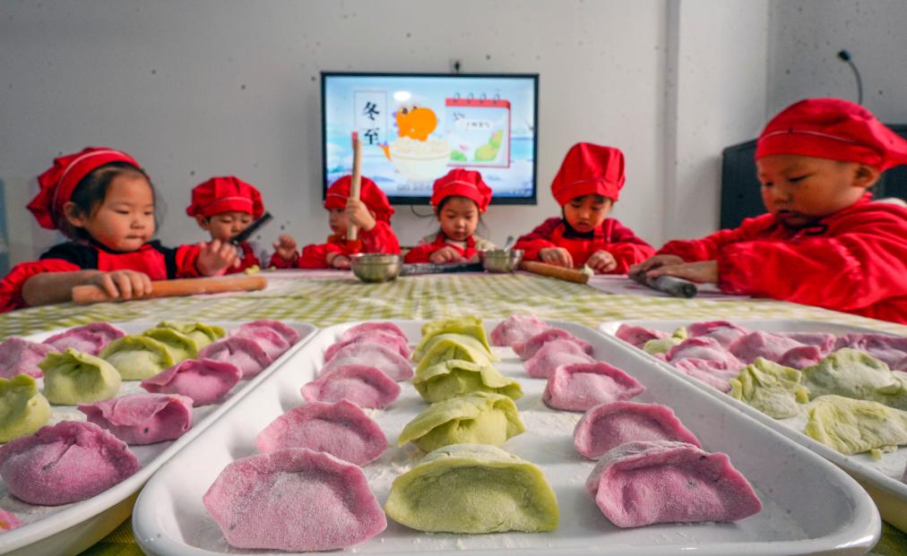 2021年12月21日,冬至,江苏省扬州市一家幼儿园的小朋友展示包好的饺子。新华社发(孟德龙 摄)
