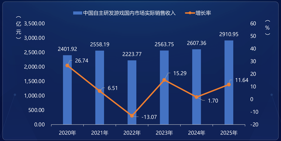 自主研发游戏国内市场实际销售收入2910.95亿元