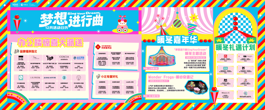 北外滩来福士:以“音乐剧”为核心灵感,将商业空间转化为沉浸式舞台,打造“梦想进行曲 Sing Your Dream”暖冬主题活动,四大年代互动音乐装置串联时空梦想旅程。