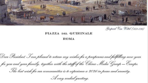 在2026年新年即将到来之际,意大利总统府新闻发言人格拉索、意大利足协主席格拉维纳等给中央广播电视总台台长慎海雄发来贺信,向总台全体员工致以最美好、最诚挚的节日祝福。
