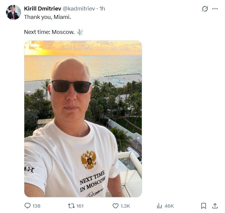 当地时间21日,德米特里耶夫在社交平台X上发布了一张以迈阿密日落为背景的自拍照。照片中,他身着一件印有俄罗斯国徽的白色T恤,T恤上印有 “下次莫斯科见” 的字样以及俄罗斯总统普京的签名。据报道,此前在阿拉斯加会晤期间,普京曾用这句英文原话邀请美国总统特朗普赴莫斯科举行会谈。