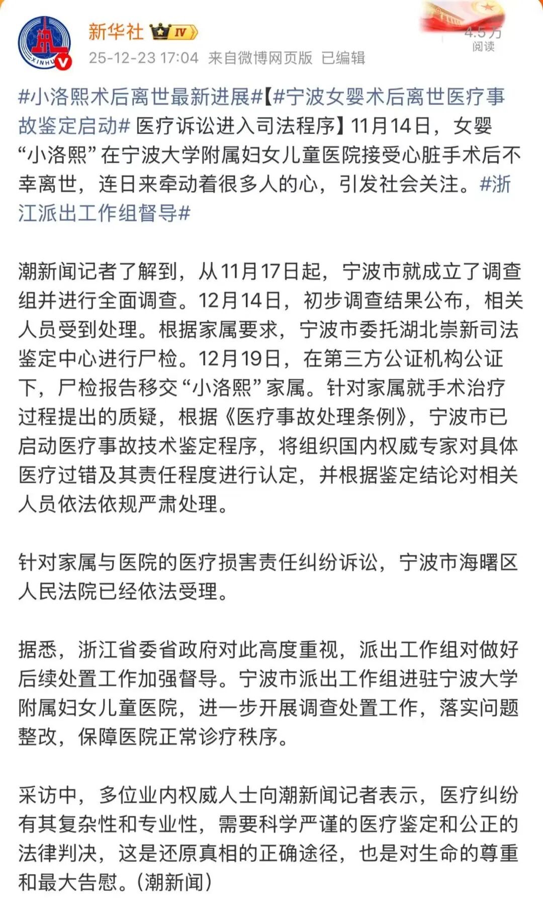 潮新闻记者了解到,从11月17日起,宁波市就成立了调查组并进行全面调查。12月14日,初步调查结果公布,相关人员受到处理。根据家属要求,宁波市委托湖北崇新司法鉴定中心进行尸检。12月19日,在第三方公证机构公证下,尸检报告移交“小洛熙”家属。针对家属就手术治疗过程提出的质疑,根据《医疗事故处理条例》,宁波市已启动医疗事故技术鉴定程序,将组织国内权威专家对具体医疗过错及其责任程度进行认定,并根据鉴定结论对相关人员依法依规严肃处理。
