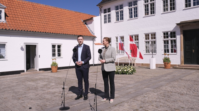 2025年4月27日,在丹麦哥本哈根附近的马林堡,丹麦首相弗雷泽里克森(右)与格陵兰岛自治政府总理延斯-弗雷德里克·尼尔森共同会见记者。