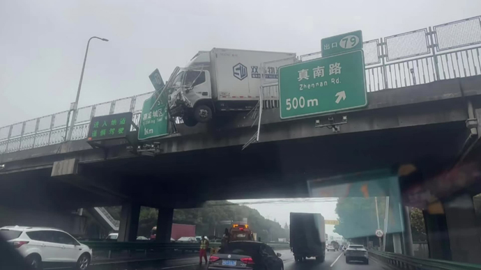 12月24日中午,S20外环高速内圈近真南路发生事故,一辆厢式货车在外环上方的跨线桥上撞破防护网,处于半悬空状态,多块护栏损坏,坠落至下方的外环高速主线道路,砸到了一辆平板牵引车和一辆轿车。截至下午2时15分,事故已处理完毕。现场无人员伤亡,事故原因有待调查。