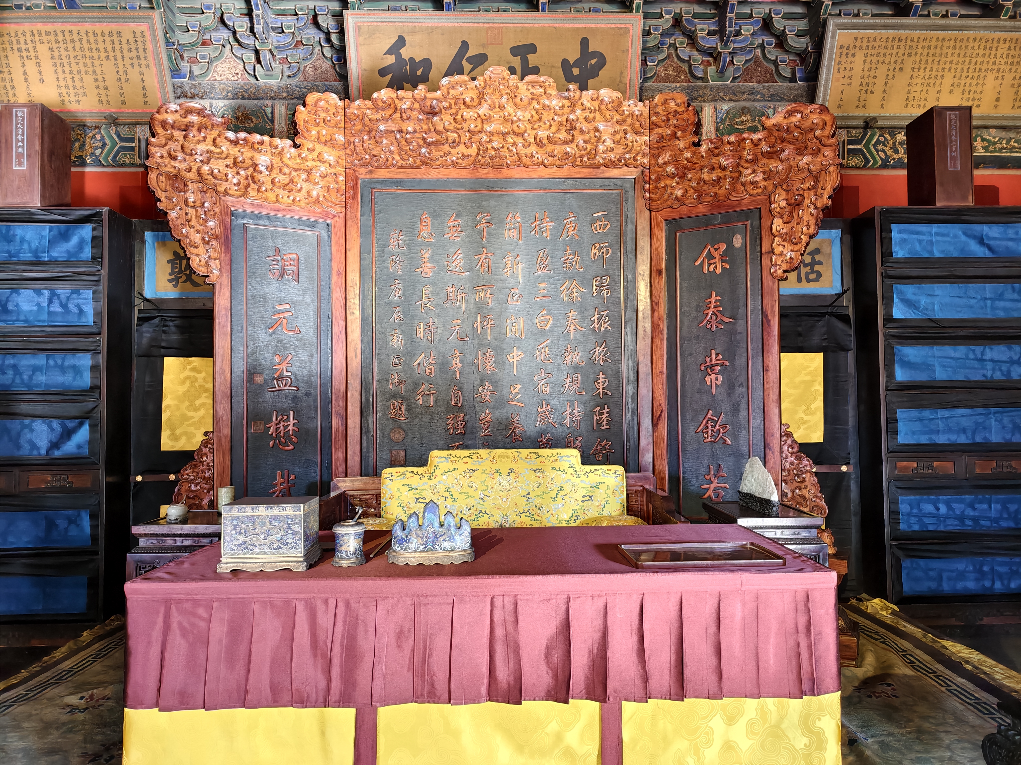 原状陈列遵循历史原貌。养心殿室内正殿宝座上方悬挂雍正御笔“中正仁和”匾,西暖阁“勤政亲贤”匾额下的楹联恢复如初,三希堂内则按记载还原了乾隆时期的陈列场景。