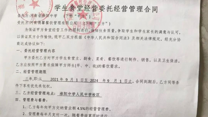 德馨餐饮公司与淮阳中学签订的委托经营管理合同,合同约定校方收取营业额的4.5%作为管理费。受访者供图