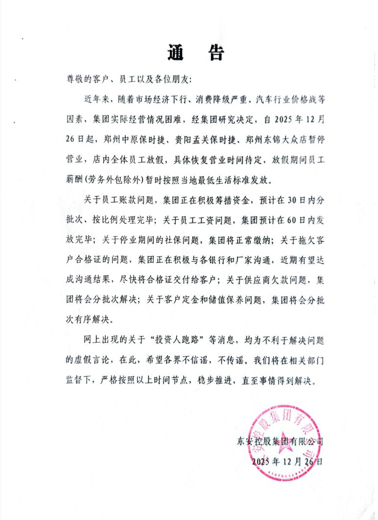 近年来,随着市场经济下行,消费降级严重,汽车行业价格战等因素,集团实际经营情况困难,经集团研究决定,自2025年12月26日起,郑州中原保时捷、贵阳孟关保时捷、郑州东锦大众店暂停营业,店内全体员工放假,具体恢复营业时间待定,放假期间员工薪酬(劳务外包除外)暂时按照当地最低生活标准发放。