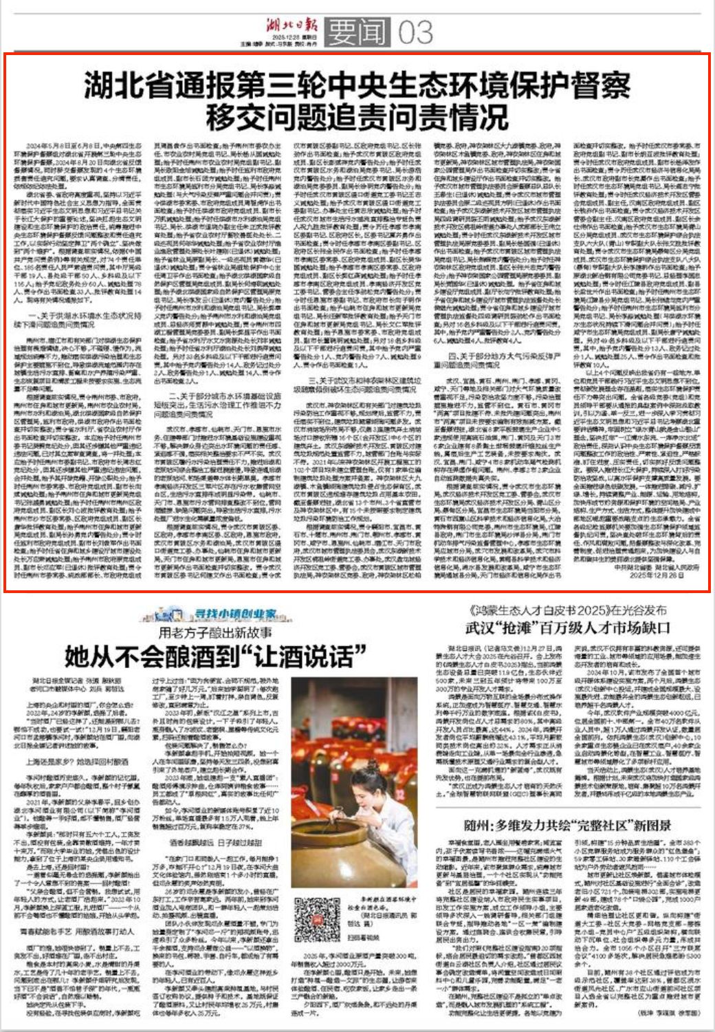据《湖北日报》12月28日消息,湖北省委、省政府高度重视,坚持以习近平新时代中国特色社会主义思想为指导,全面贯彻落实习近平生态文明思想和习近平总书记关于长江大保护的重要论述,坚决扛起生态文明建设和生态环境保护的政治责任,统筹推进中央生态环境保护督察反馈问题整改和责任追究工作,以实际行动坚定捍卫“两个确立”、坚决做到“两个维护”。