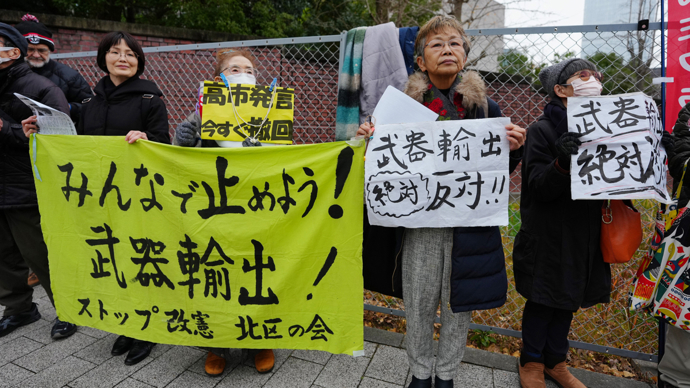 针对日本执政联盟自民党与日本维新会拟取消对武器出口的5种类型限制、为武器出口大幅“松绑”,日本民众25日下午在位于东京的自民党总部前举行抗议集会。