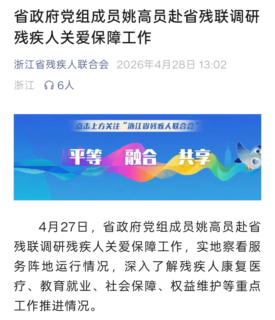 据浙江省残疾人联合会微信公众号,4月27日,省政府党组成员姚高员赴省残联调研残疾人关爱保障工作,实地察看服务阵地运行情况,深入了解残疾人康复医疗、教育就业、社会保障、权益维护等重点工作推进情况。