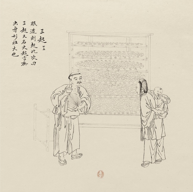 先说说技术上的“实”。三版合计400多幅白描,从栽桑、养蚕、缫丝到织造、染色、营销,每一步均清晰呈现。比如栽桑部分,A版里细绘“再扫(蚕)屎、再眠、再起、再落叶、三扫屎、三眠、三起、爽食、大食、分大窝、倒蚕屎”的流程。