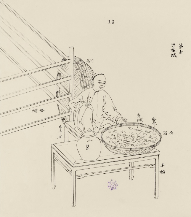 再说说图版的设计。图版按版本分类排列:A版、B1版、B2版各成一组,每幅图下标有编号、原文、释文、法文、粤语等信息。如A版“斩桑枝”图,下面既列原文“年尾雪霜既,桑枝苍老,则用刀斩去长枝”,法文“Taille des mûriers nains”,亦附释文“冬天桑枝老化后,砍去长枝保留主干,来年春天就能发出新枝”。B1版中“出蚕蛾”图,标注“蚕架、竹䈑、蚕䈑、蚕壳、蚕蛾、罂、木斗方、木台”图中信息,搭配法文“Les papillons percent leurs cocons”及粤语“Tchu-tsan-ngo”。这样一来,技术研究者与外销文化爱好者都能找到对应的内容。