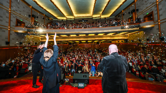 2026年1月1日0点,上海大光明电影院跨年特别活动现场,嘉宾与观众一起庆祝新年。