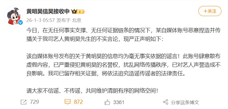 黄明昊工作室:“该自媒体账号发布的关于黄明昊的信息均为毫无事实依据的谣言!我司已留存相关证据,将依法追究造谣传谣者的法律责任。”