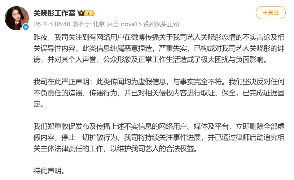 王安宇工作室、关晓彤工作室双双发布声明否认恋情:“相关内容均属凭空捏造。”已进行证据固定并将采取法律手段追责。
