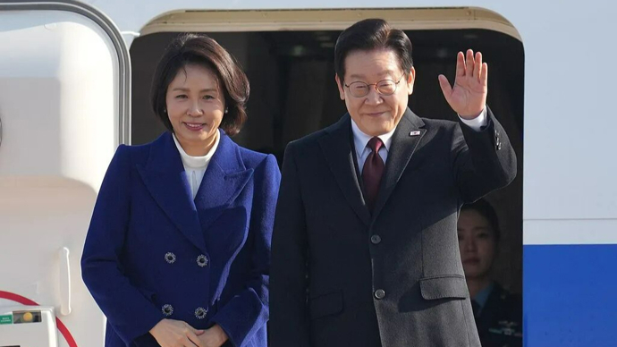 当地时间1月4日 韩国总统李在明和夫人金惠景在首尔机场准备启程前往中国。图源:央视新闻