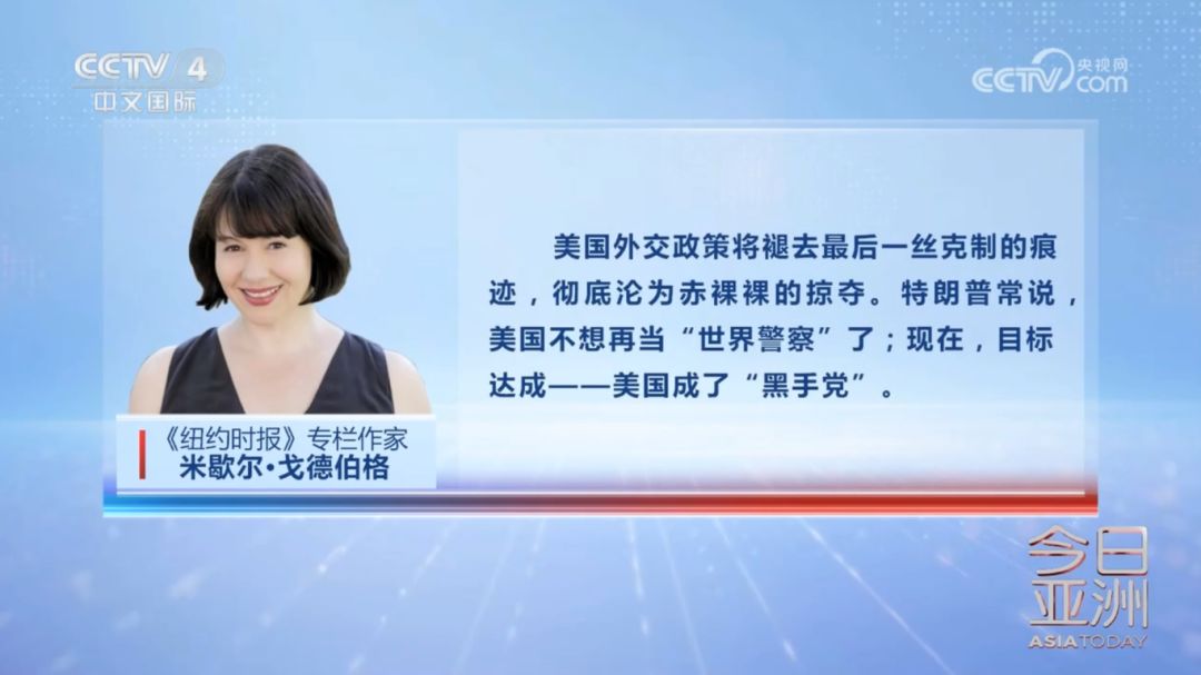 戈德伯格指出,美国外交政策将褪去最后一丝克制的痕迹,彻底沦为赤裸裸的掠夺。特朗普常说,美国不想再当“世界警察”了;现在,目标达成——美国成了“黑手党”。