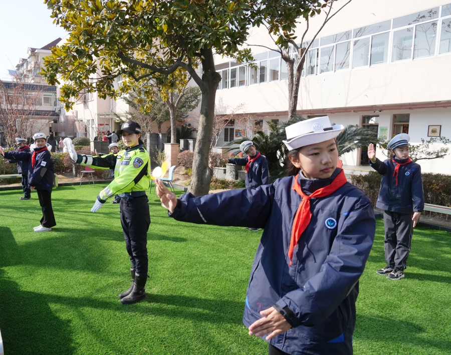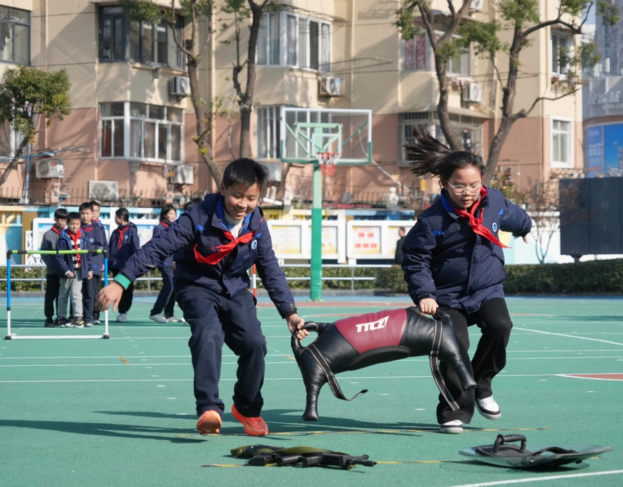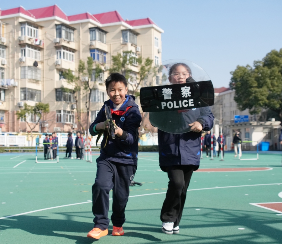浦东交警和孩子一起做交通安全手势操;周家渡派出所的法治反诈课堂用生动案例剖析了校园欺凌、电信网络诈骗等案件的危害及法律后果;浦东刑侦支队刑侦民警带来了简易的现场勘查器材,演示破案过程;浦东特警组织学生进行基础训练与团队协作游戏。