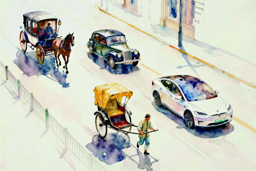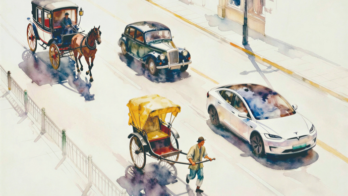 19世纪50年代后,西侨带来的西式马车驶上上海街头。与传统的骡马车相比,这些舶来品有双轮四轮和单马双马之分,且都“前轴上安置转向盘,车身两侧有车门,轮箍用铁或胶皮围成,车身和车轴之间由弹簧连接,使乘坐者减少颠簸”。