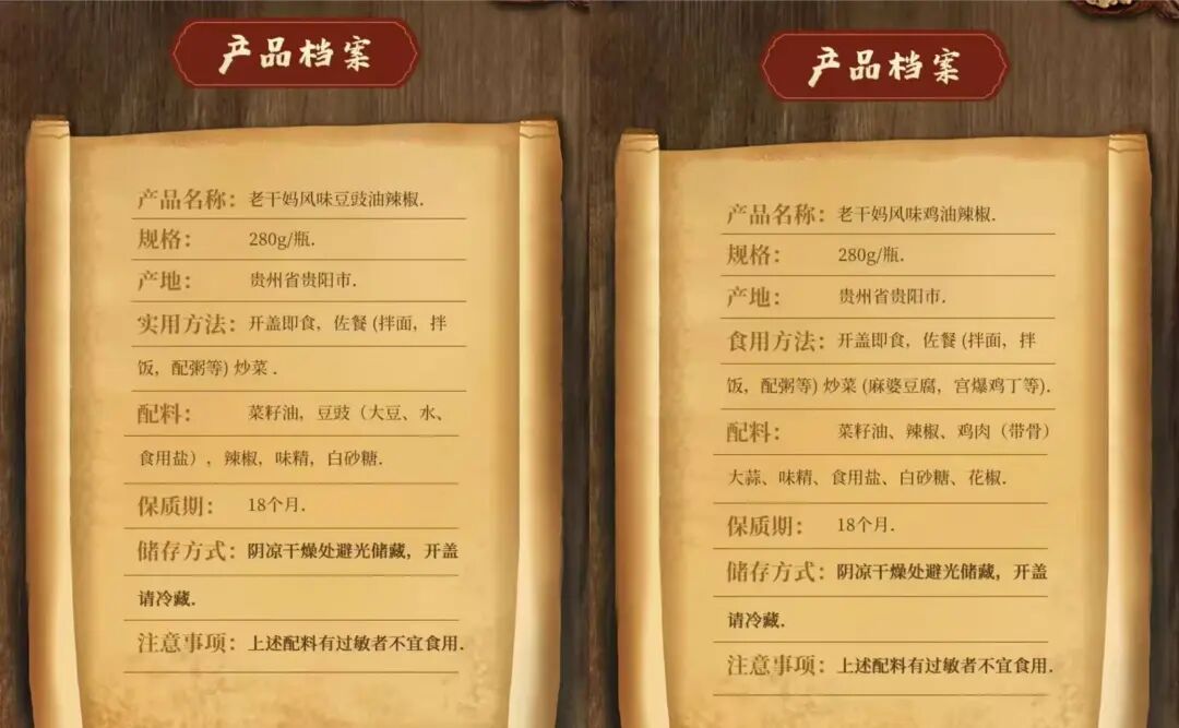 查询电商平台老干妈旗舰店了解到,“老干妈风味豆豉油辣椒”的配料包括菜籽油、豆豉(大豆、水、食用盐),辣椒、味精、白砂糖。“老干妈风味鸡油辣椒”的配料包括菜籽油、辣椒、鸡肉(带骨)、大蒜、味精、食用盐、白砂糖、花椒。